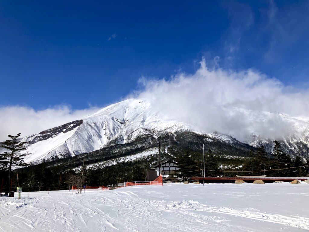リフトに乗りながら目の前に見える山の頂上がゲレンデのトップなんだと最初思ってましたが、あの山は御嶽山でした。近すぎて、あそこは他のスキー場のゲレンデだとしばらく勘違いしてました。