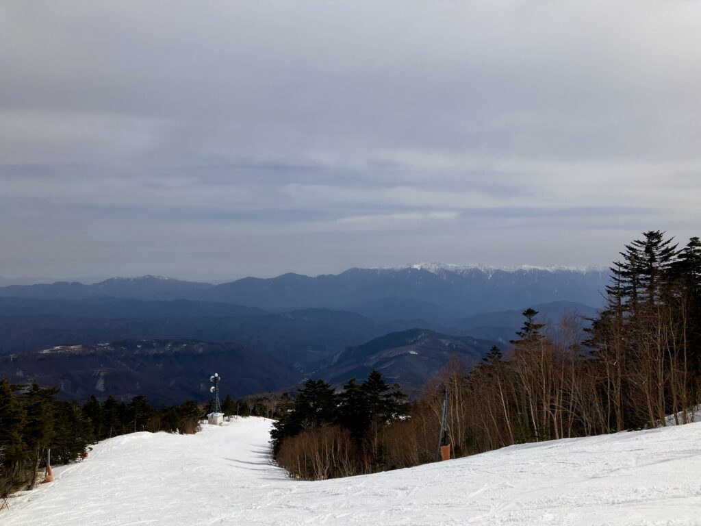 中央アルプスを眺めながら滑る。後ろには南アルプスも。